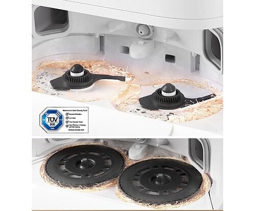 7-in-1-Automatikstation: Entleert den Behälter, trocknet mit Warmluft und füllt Wasser und Reinigungslösung nach.