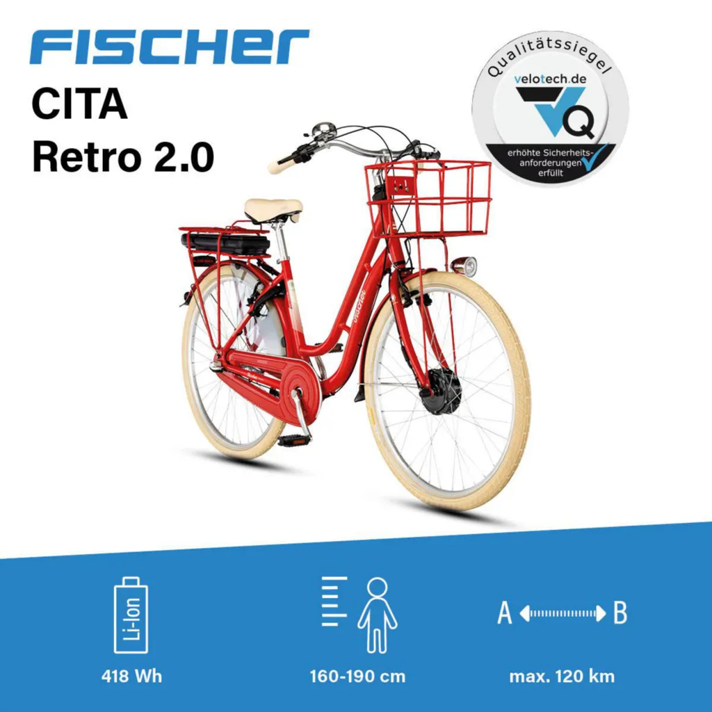 FISCHER E-Bike Pedelec City Cita Retro 2.0, Rahmenhöhe 48 cm, 28 Zoll, Akku 418 Wh,
