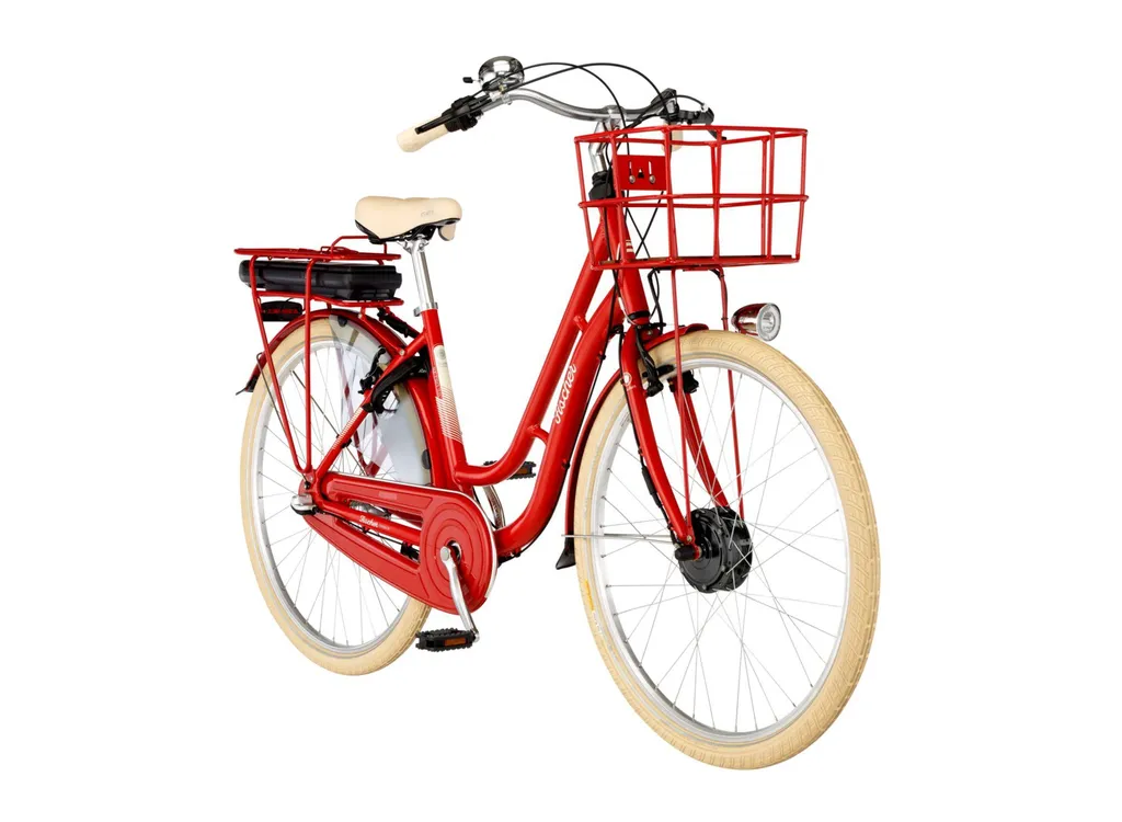 FISCHER E-Bike Pedelec City Cita Retro 2.0, Rahmenhöhe 48 cm, 28 Zoll, Akku 418 Wh, Vorderradmotor, tiefer Einstieg, Nabenschaltung, LED Display, rot